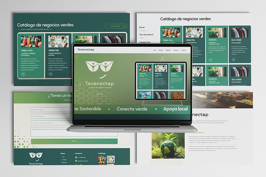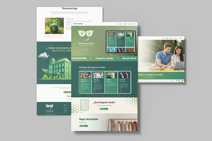 The project focuses on creating a clean and intuitive interface where users can explore a catalog of green businesses and discover sustainable products and services. The platform includes a searchable catalog with filters by category, city, and location, allowing users to quickly find businesses aligned with conscious consumption.